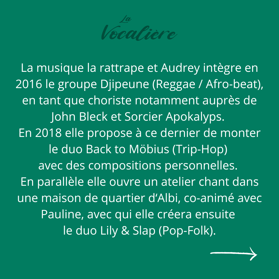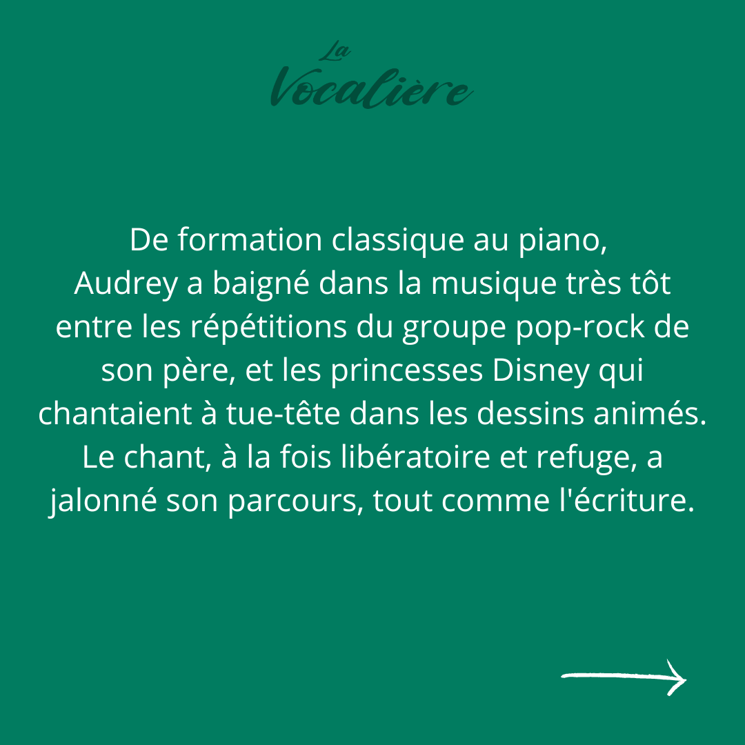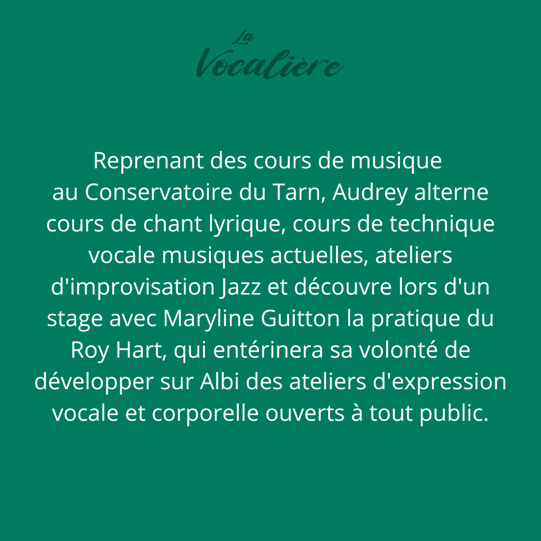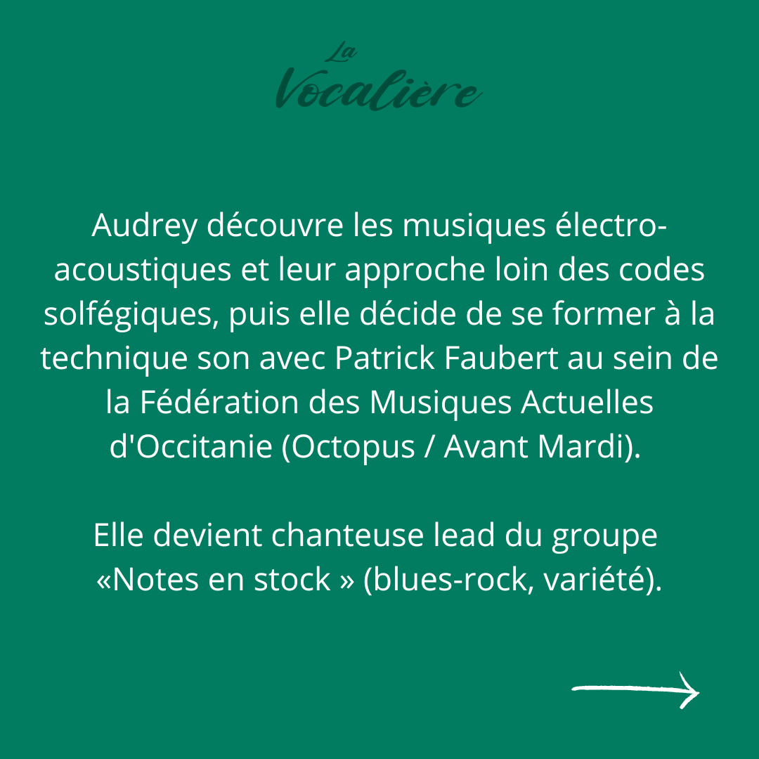 Audrey est artiste intervenante dans le cadre de médiations autour de la pratique vocale.