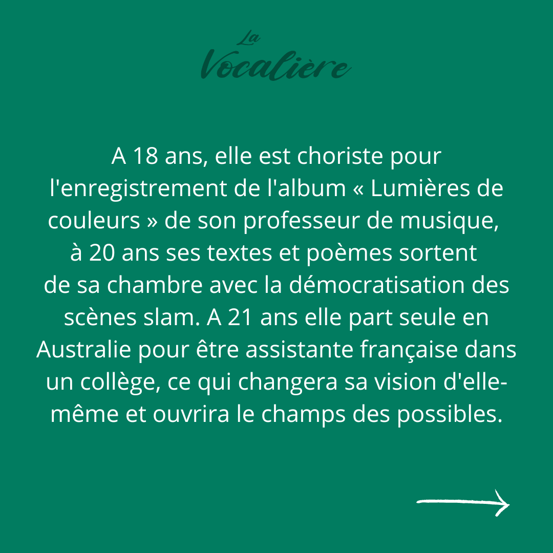 « L’association La Vocalière propose différents ateliers autour de la pratique vocale, principalement par la voix chantée, qui s’adressent aux particuliers et aux structures sociales. D’un côté je propose des cours individuels de chant, musique actuelle et jazz vocal, via lesquels l’élève peut apprendre un morceau, une chanson, on travaille la musique, la justesse, l’interprétation. D’un autre côté je propose des ateliers voix qui sont en marge du spectacle vivant et de la production musicale : ce sont avant tout des ateliers d’expression de soi durant lesquels les participants vont découvrir et s’essayer à différentes façon de vocaliser, différentes façons de faire sonner sa voix grâce à l’engagement du corps. On est davantage sur une expérimentation corporelle du souffle, du son, de la vibration, du mouvement, que sur un apprentissage musical. Pour autant, je tiens à faire le lien avec la musique par la voix chantée pour permettre à chacun de développer sa créativité grâce à la sensibilité artistique. Les improvisations sont un des outils pour expérimenter, apprendre à lâcher prise, oser inventer, dans l’instant présent, sans chercher à exploiter un résultat. »