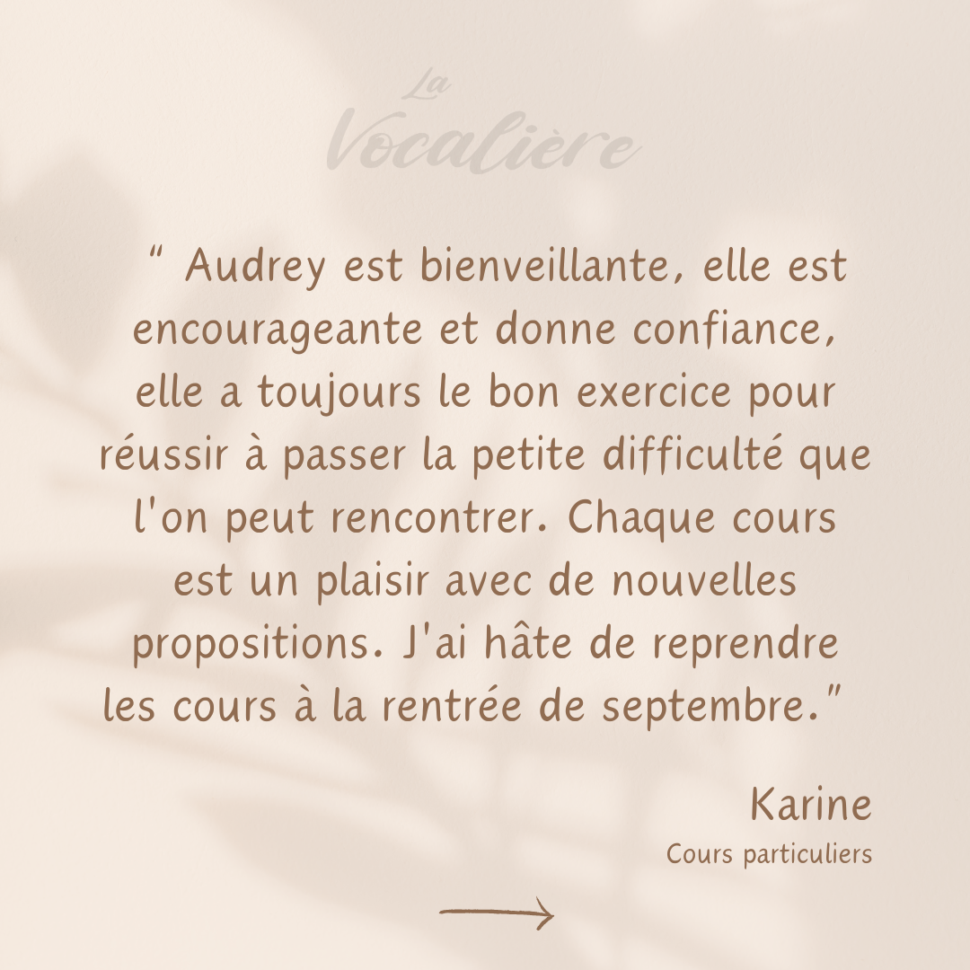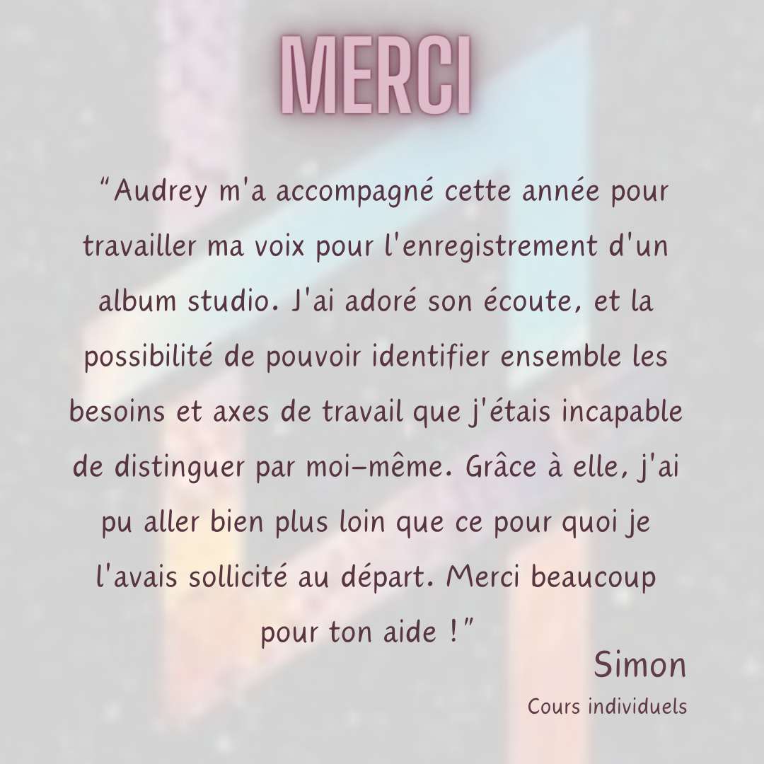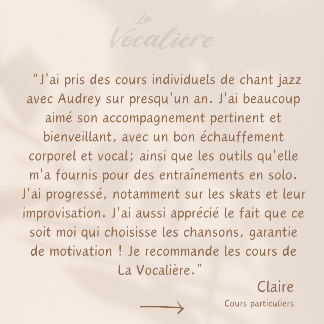 J’encourage fortement les chanteurs qui n’ont pas de formation musicale à venir développer leur oreille et leur apprentissage rythmique en cours de chant. La technique vocale est abordée en profondeur lorsque l’élève est autonome dans l’apprentissage d’un morceau, ce qui n’empêche pas les débutants de développer leur rapport au corps et à la voix lors d’exercices d’échauffement ciblés. Les débutants sont encouragés à s’inscrire à l’atelier collectif « En corps une voix » du mercredi soir, accessible à tout public, afin de bénéficier de la dynamique de groupe et progresser plus rapidement grâce aux 2 heures de pratique hebdomadaires.