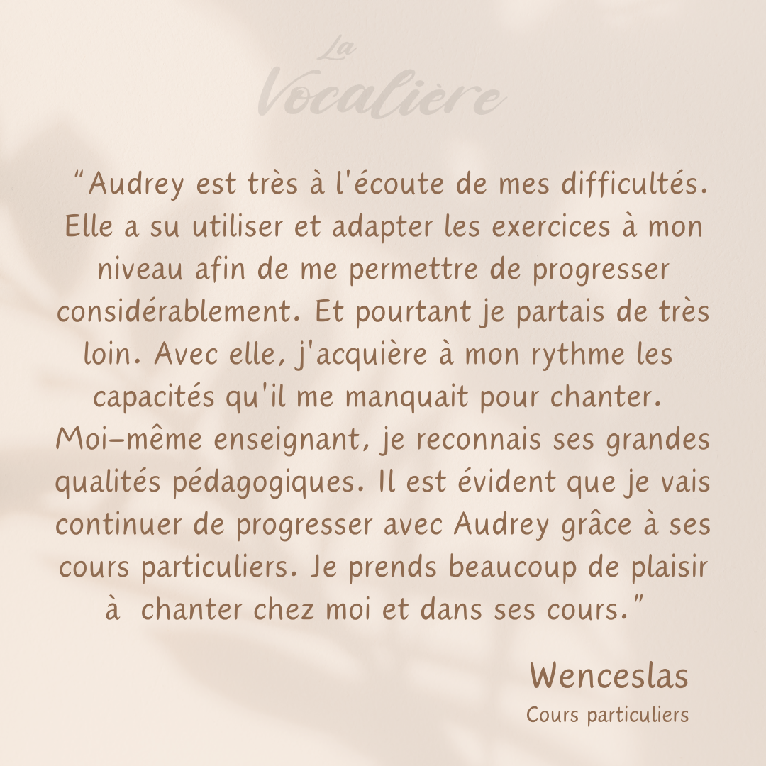 Je conseille aux débutants en musique de se déplacer en salle afin de bénéficier du soutien de l’accompagnement au piano. Les cours à domicile sont davantage accessibles aux chanteurs autonomes dans l’apprentissage du morceau et qui souhaitent développer leur technique vocale.